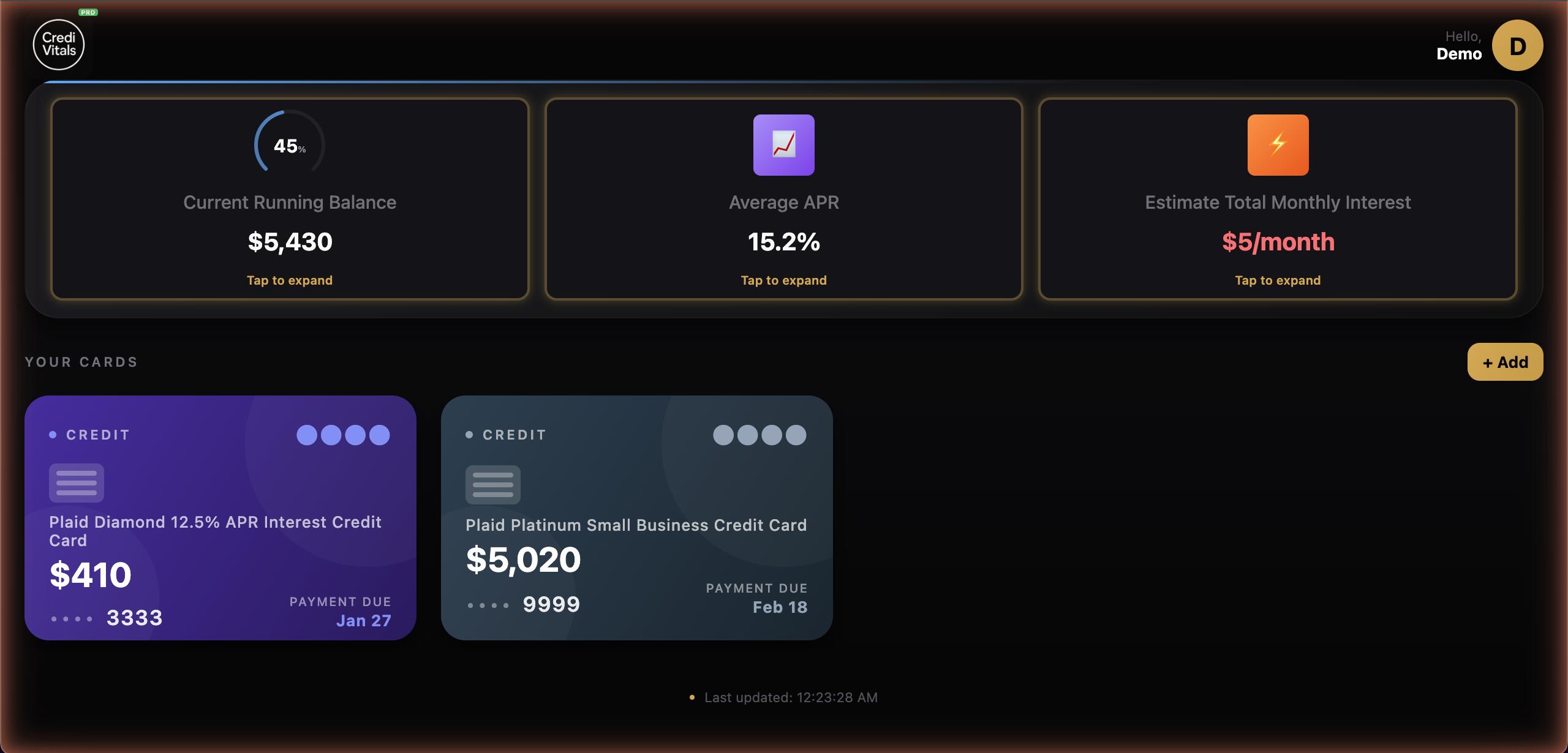 Track spending, balances, interest payments, and due dates — instantly all in one dashboard.